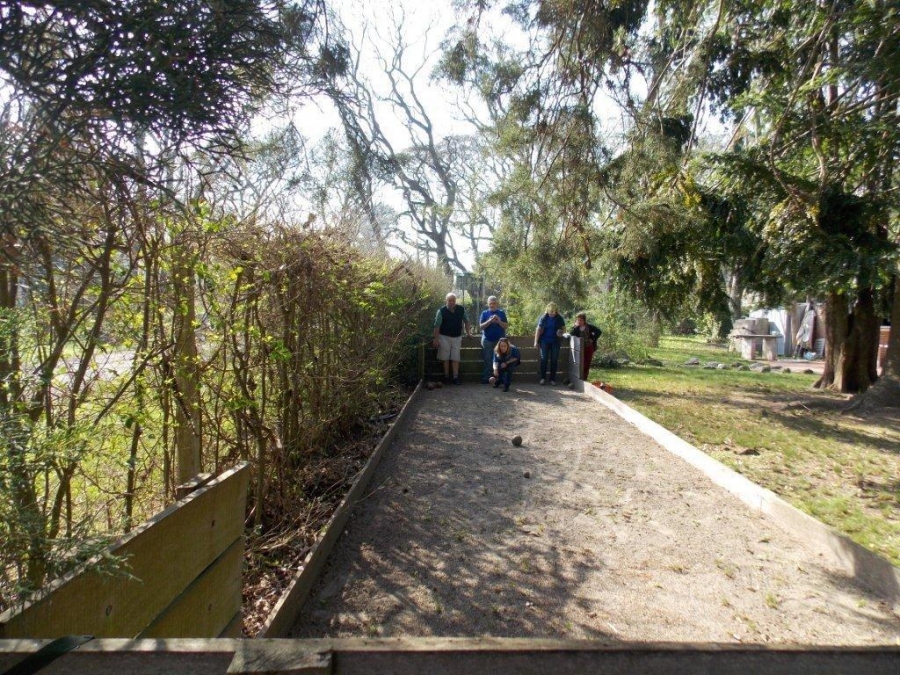 Gran parque en el fondo con cancha de bochas y parrillero.